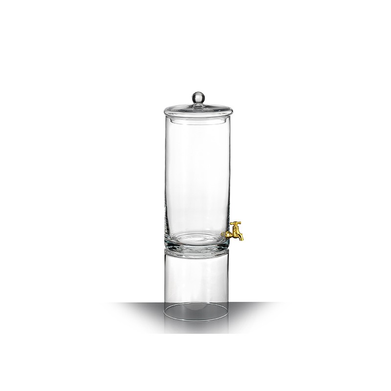 Βάζο από φυσητό γυαλί με καπάκι και βρυσάκι. Η βάση είναι ξεχωριστό κυλινδρικό κομμάτι. Το βρυσακι ειναι πλαστικό σε νίκελ χρώμα