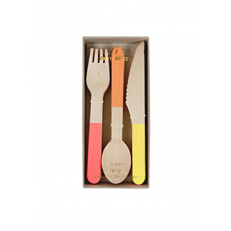 Ξύλινα μαχαιροπίρουνα με χρωματισμένη λαβή σε νέον αποχρώσεις. Μήκος 17 εκ. Το σετ περιλαμβάνει 8 πιρούνια, 8 μαχαίρια και 8 κουτάλια.