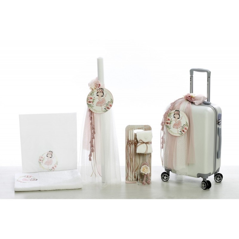 Σετ Βάπτισης (βαλίτσα, λαμπάδα, σταν λαδιού, λαδόπανα) με θέμα Μπαλαρίνα. Διάσταση βαλίτσας (Υ.57 Μ.40 Π.22). Διαθέσιμο κατόπιν παραγγελίας, εντός 15 ημερών.