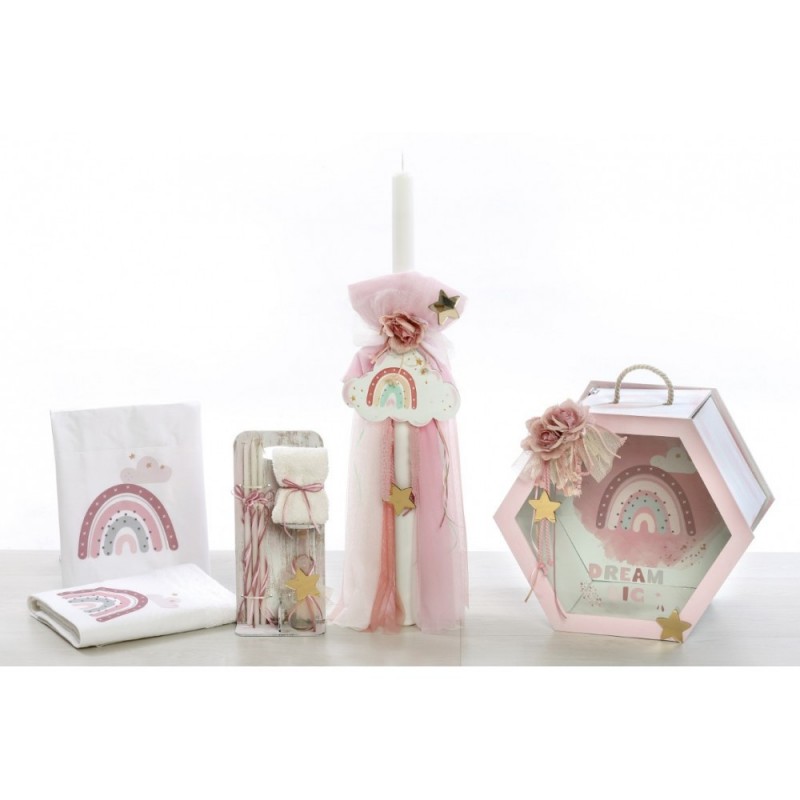 Σετ Βάπτισης (κουτί, λαμπάδα, σταν λαδιού, λαδόπανα) με θέμα Ουράνιο Τόξο. Διαθέσιμο κατόπιν παραγγελίας, εντός 15 ημερών.