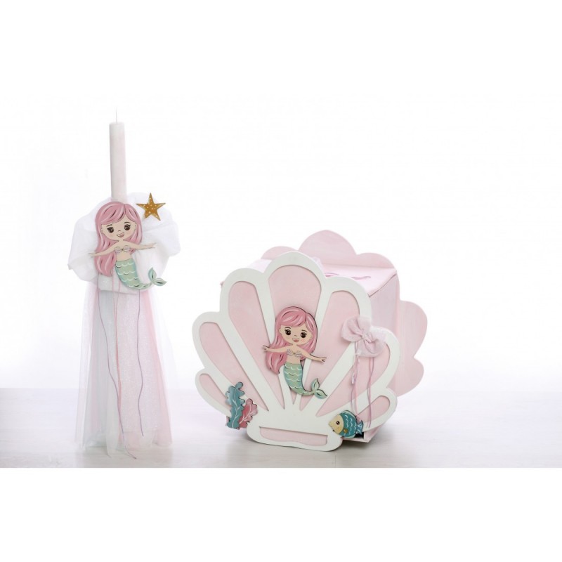 Σετ Βάπτισης (κουτί, λαμπάδα, σταν λαδιού, λαδόπανα) με θέμα Γοργόνα. Διαθέσιμο κατόπιν παραγγελίας, εντός 15 ημερών.