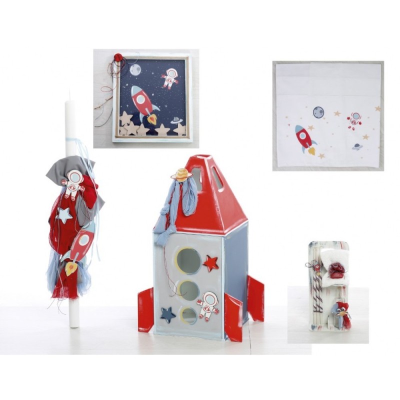 Σετ Βάπτισης (κουτί, λαμπάδα, σταν λαδιού, λαδόπανα) με θέμα Διάστημα. Διάσταση κουτιού 70cm x 40cm. Διαθέσιμο κατόπιν παραγγελίας, εντός 15 ημερών.