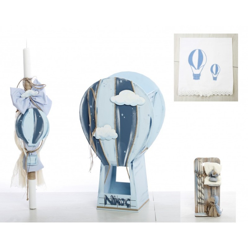 Σετ Βάπτισης (κουτί, λαμπάδα, σταν λαδιού, λαδόπανα) με θέμα Αερόστατο. Διάσταση κουτιού 75cm x 45cm. Διαθέσιμο κατόπιν παραγγελίας, εντός 15 ημερών.