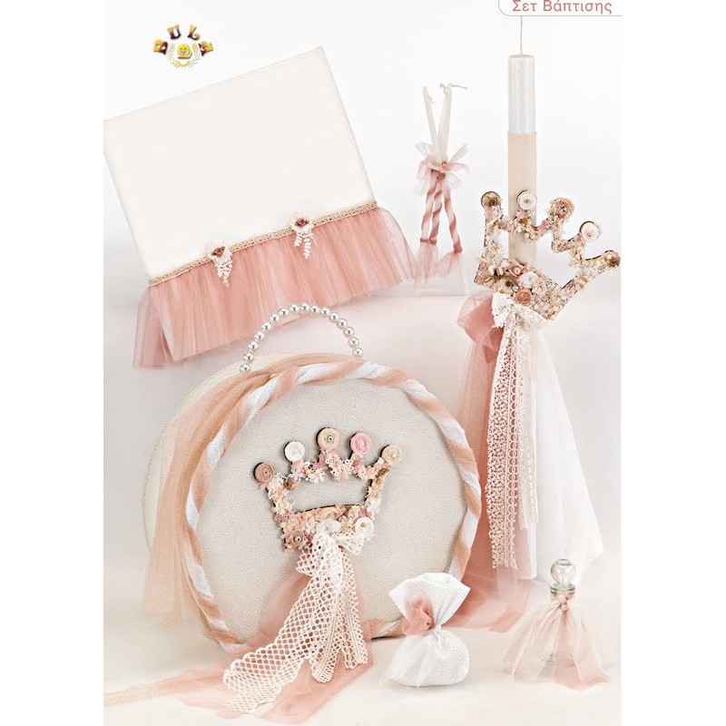 Σετ Βάπτισης (τσάντα, λαμπάδα, σετ λαδιού, λαδόπανα) με θέμα Κορώνα. Διαθέσιμο κατόπιν παραγγελίας, εντός 15 ημερών.