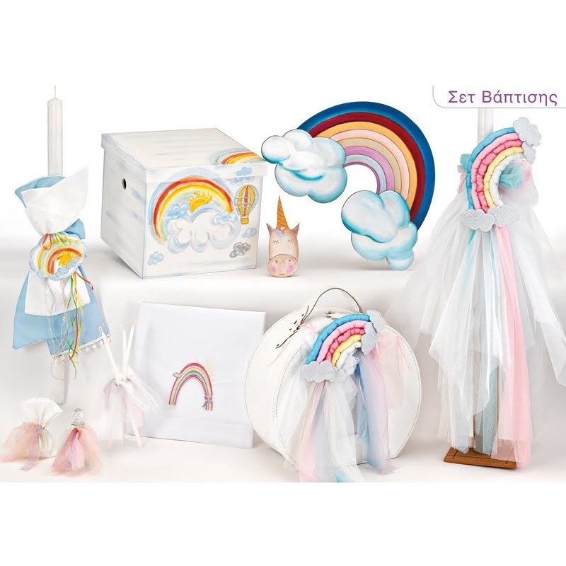 Σετ Βάπτισης (τσάντα ή κουτί, λαμπάδα, σετ λαδιού, λαδόπανα) με θέμα Ουράνιο Τόξο. Διαθέσιμο κατόπιν παραγγελίας, εντός 15 ημερών.