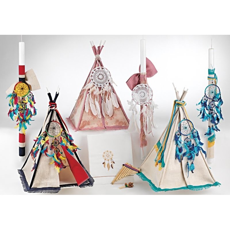 Σετ Βάπτισης (σκηνή, λαμπάδα, σετ λαδιού, λαδόπανα) σε 3 διαφορετικά χρώματα με θέμα Ινδιάνος. Διαθέσιμο κατόπιν παραγγελίας, εντός 15 ημερών.