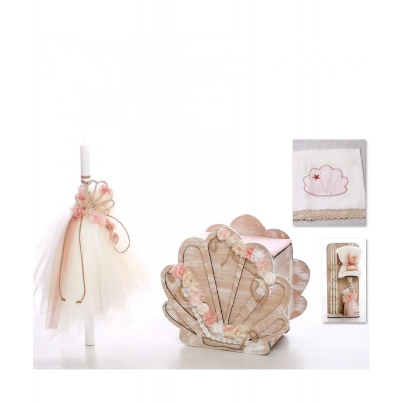Σετ Βάπτισης (κουτί, λαμπάδα, σετ λαδιού, λαδόπανα) με θέμα Κοχύλι. Διαθέσιμο κατόπιν παραγγελίας, εντός 15 ημερών.
