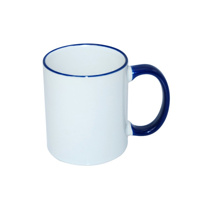 Κούπα λευκή με χρωματιστό χείλος και χερούλι σε μπλε χρώμα και με τύπωμα φωτογραφίας ή μηνύματος της αρεσκείας σας. Τυπώνουμε ό,τι επιθυμείτε. Ιδανικές για δωράκια, μπομπονιέρες ή αναμνηστικά. Κεραμική κούπα 11oz. Δεν μπαίνει σε φούρνο μικροκυμάτων και πλυντήριο πιάτων.