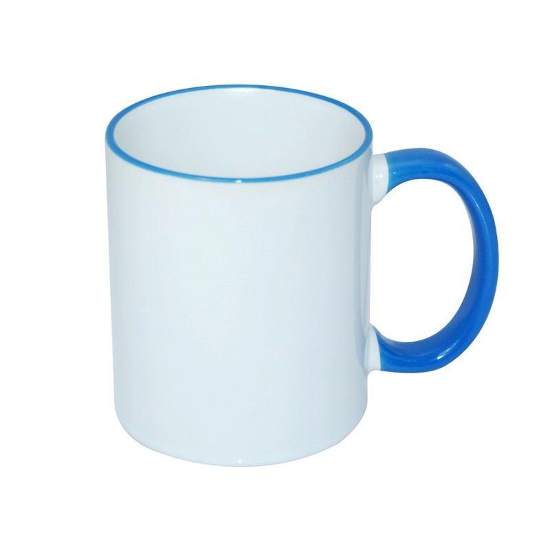 Κούπα λευκή με χρωματιστό χείλος και χερούλι σε γαλάζιο χρώμα και με τύπωμα φωτογραφίας ή μηνύματος της αρεσκείας σας. Τυπώνουμε ό,τι επιθυμείτε. Ιδανικές για δωράκια, μπομπονιέρες ή αναμνηστικά. Κεραμική κούπα 11oz. Δεν μπαίνει σε φούρνο μικροκυμάτων και πλυντήριο πιάτων.