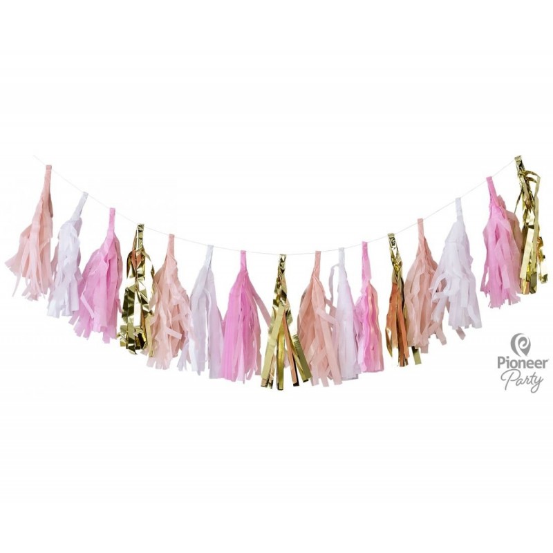 Γιρλάντα 2m με 12 φούντες Χρυσό Λευκό Ροζ.