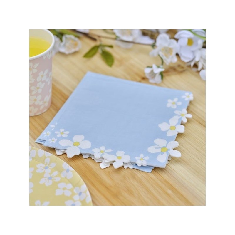 Χαρτοπετσέτες μεσαίες 16cm σε χρώμα γαλάζιο με άσπρα λουλουδάκια στο τελείωμα.