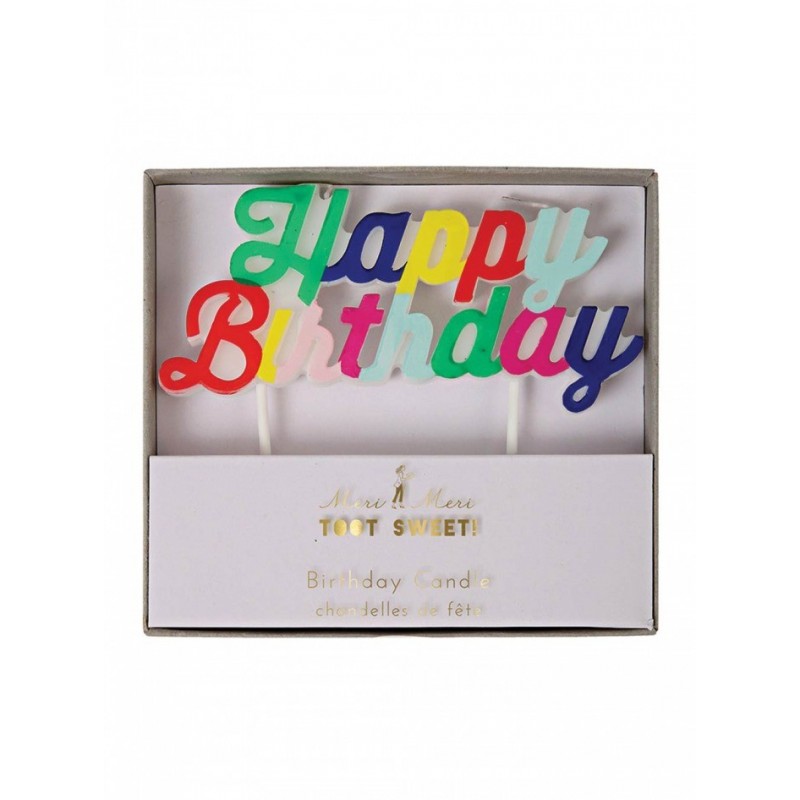 Πολύχρωμo κεράκι τούρτας γενεθλίων Meri Meri με μήνυμα Happy Birthday. Διαστάσεις συσκευασίας: 10 x 15 x 2εκ