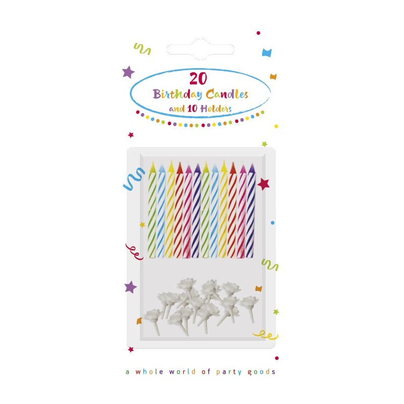 20 κεράκια τούρτας γενεθλίων ριγέ σε διάφορα χρώματα και 10 βάσεις