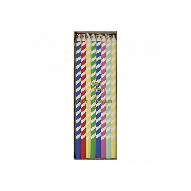 Ριγέ ψηλά κεράκια τούρτας γενεθλίων Meri Meri σε διάφορα χρώματα. Συμπεριλαμβάνονται οι βάσεις. Ύψος κεριού 14 cm.