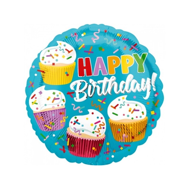 Μπαλόνι foil 17" 43cm με θέμα Happy Birthday Cup Cakes. Η τιμή αφορά το μπαλόνι ξεφούσκωτο.