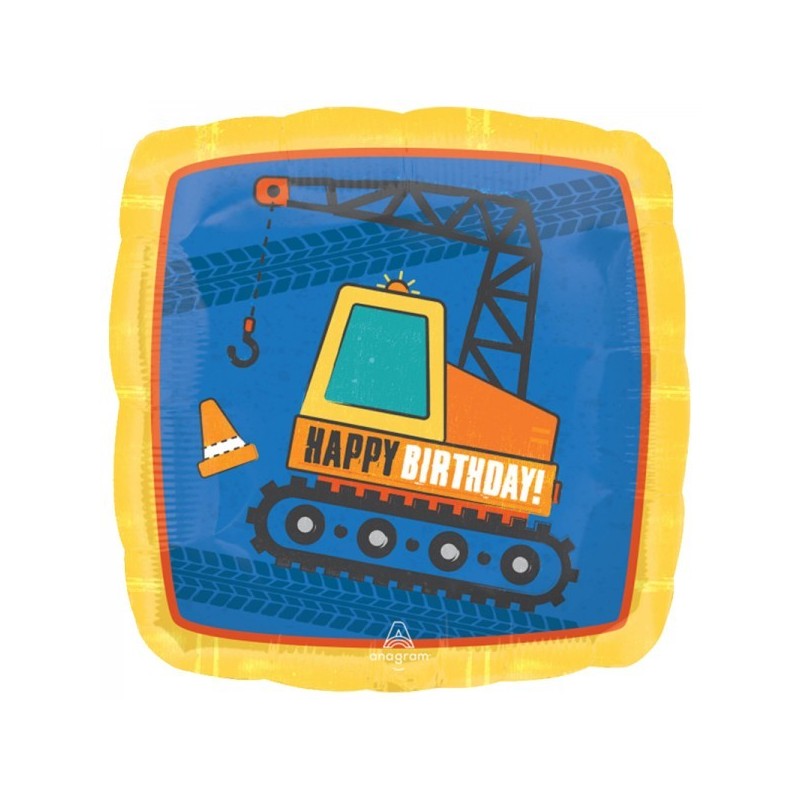 Μπαλόνι foil 17" 43cm τετράγωνο με μήνυμα Happy Birthday και θέμα μπουλντόζα. Η τιμή αφορά το μπαλόνι ξεφούσκωτο.