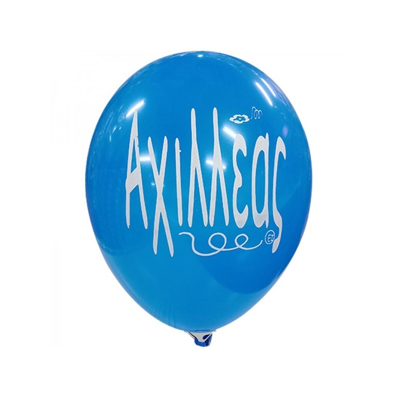 Μπαλόνια λάτεξ 12" 30cm τυπωμένα με το όνομα Αχιλλέας. Διατίθενται σε διάφορα χρώματα, η επιλογή χρωμάτων γίνεται τυχαία. Η τιμή αφορά τα μπαλόνια ξεφούσκωτα.