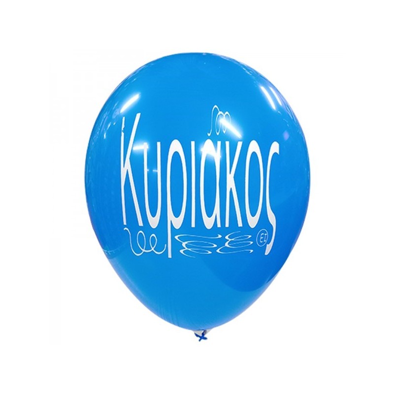 Μπαλόνια λάτεξ 12" 30cm τυπωμένα με το όνομα Κυριάκος. Διατίθενται σε διάφορα χρώματα, η επιλογή χρωμάτων γίνεται τυχαία. Η τιμή αφορά τα μπαλόνια ξεφούσκωτα.