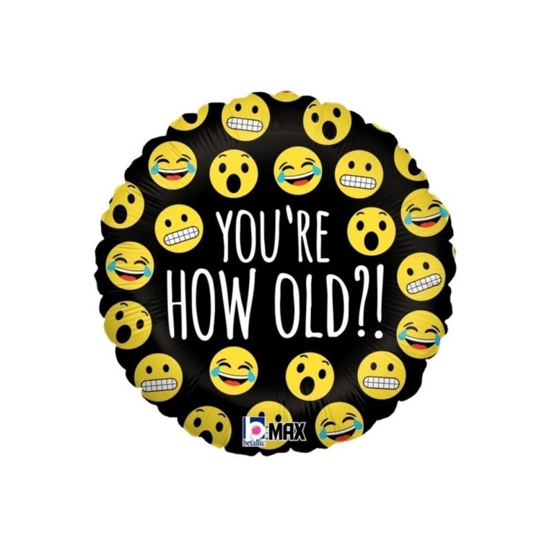 Μπαλόνι foil 18" 46cm με θέμα emoji και μήνυμα You're How Old?!. Η τιμή αφορά το μπαλόνι ξεφούσκωτο.