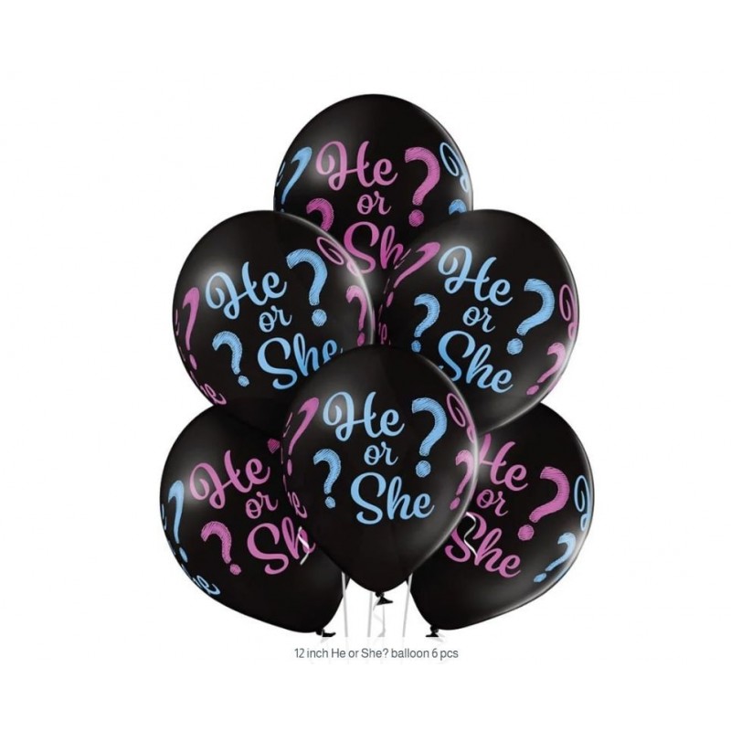 Μπαλόνια latex 11" μαύρα με μήνυμα He or She και ερωτημνατικά για αποκαλύψη φύλου. Η τιμή αφορά το μπαλόνι ξεφούσκωτο