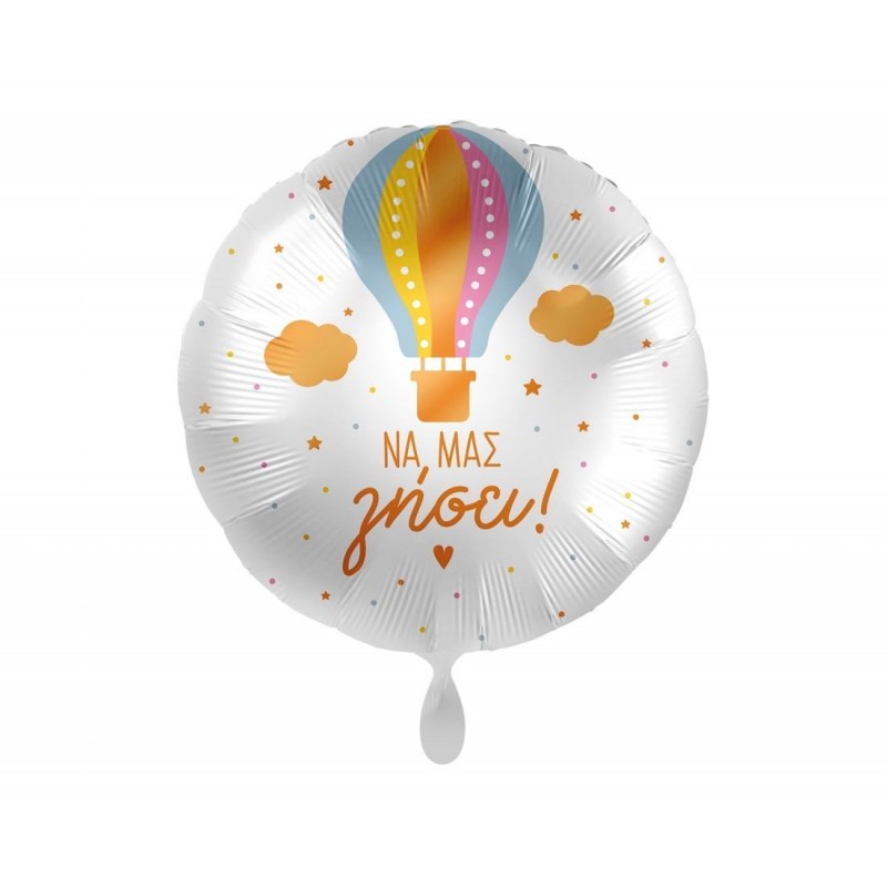 Μπαλόνι Φοιλ 17" 43 εκ. Με θέμα αερόστατο και μήνυμα Να μας Ζήσει. Η τιμή αφορά το μπαλόνι ξεφούσκωτο.