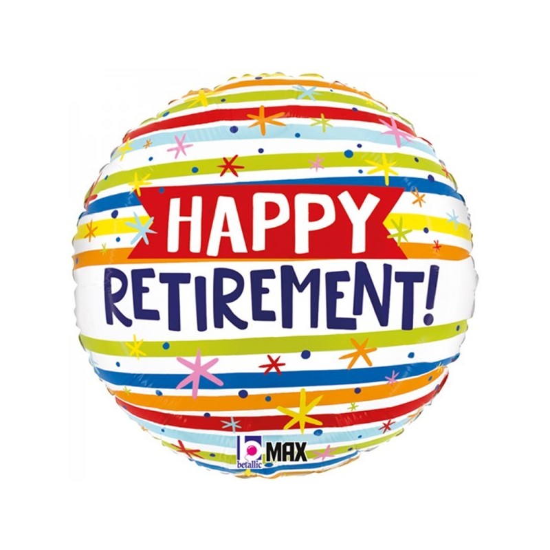 Μπαλόνι foil στρογγυλό 18'' 46cm με πολύχρωμες ρίγες για να ευχηθούμε καλή συνταξιοδότηση. Η τιμή αφορά το μπαλόνι ξεφούσκωτο.
