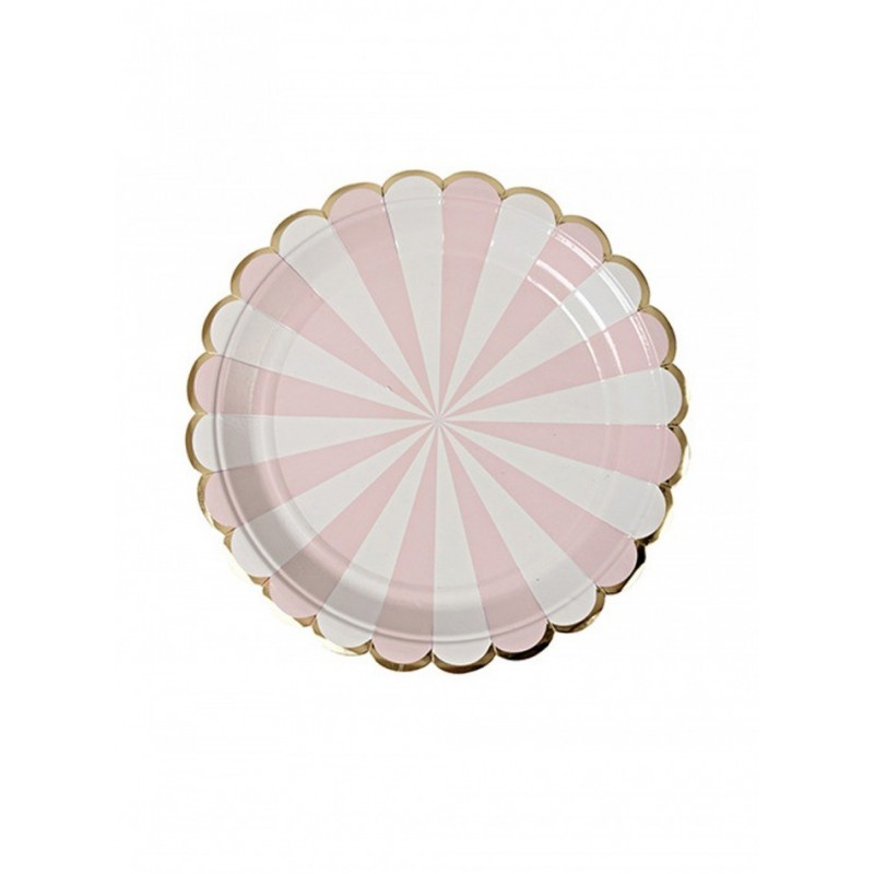 Χάρτινα πιάτα ριγέ ροζ με περίγραμμα με λεπτό χρυσό φύλλο μετάλλου (foil). Για όλες τις περιστάσεις.