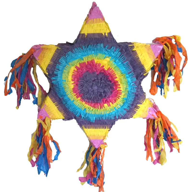 Πινιάτα με σχέδιο αστέρι με διάφορα χρώματα. Η συγκεκριμένη πινιάτα μπορεί να χρησιμοποιηθεί από τους παίκτες κτυπώντας την ή τραβώντας τις κορδέλες που διαθέτει και να ανοίξει το μυστικό πορτάκι στο νικητή.